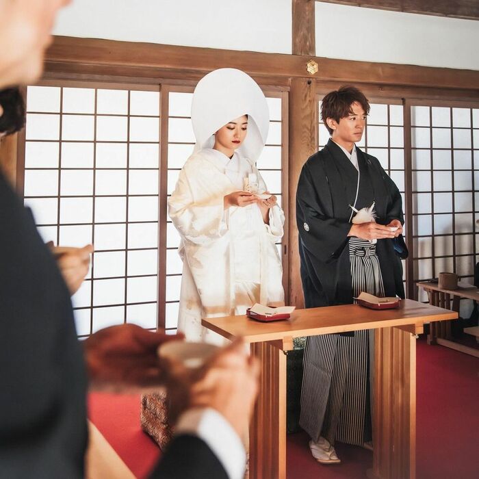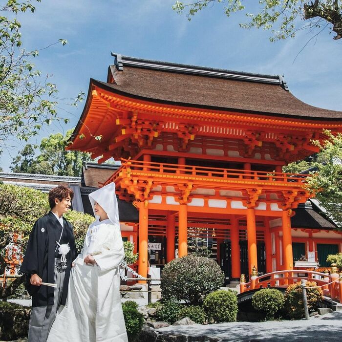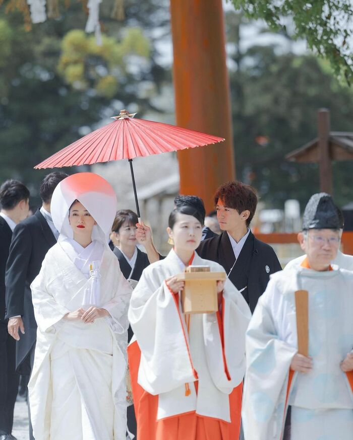 鮮やかな朱色の楼門の前で微笑み合う2人の写真や、盃を手にする神前式の様子も公開しました。