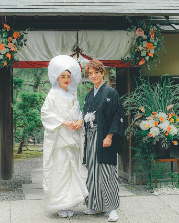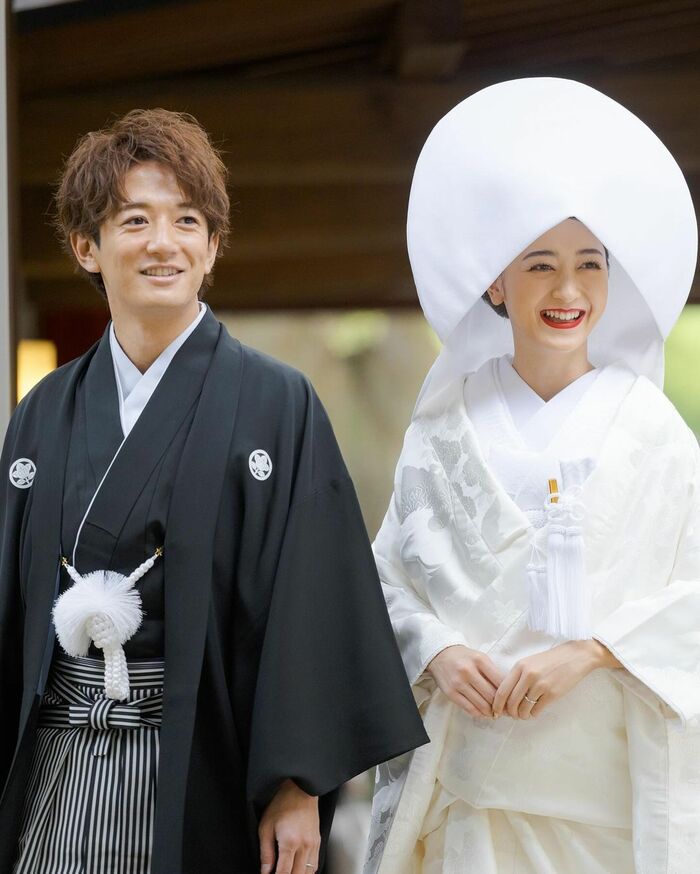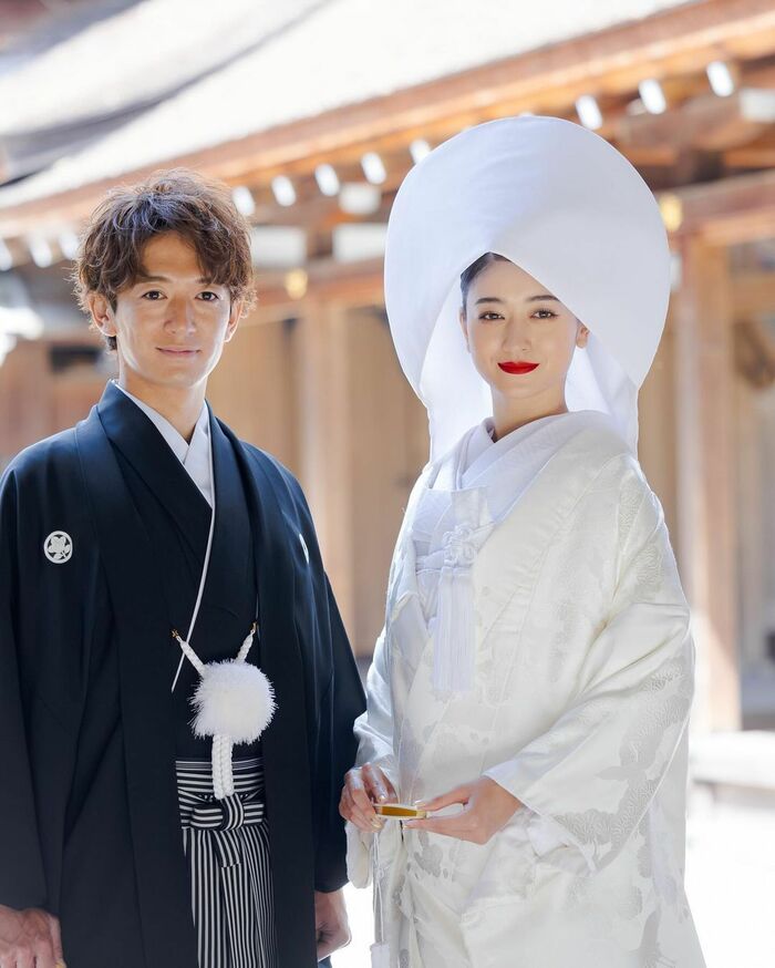 3月のハワイ挙式ではウェディングドレス姿を見せていたみちょぱさんは、打って変わって白無垢姿に身を包み、紋付袴姿の大倉さんと2人で並んだ写真を投稿。
