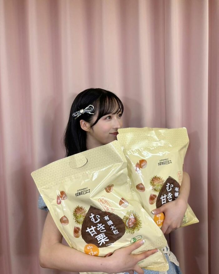 別の写真では、名字の「小栗」にちなんでか、大きな袋に入った「むき甘栗」をたくさん抱える小栗さんの姿が!