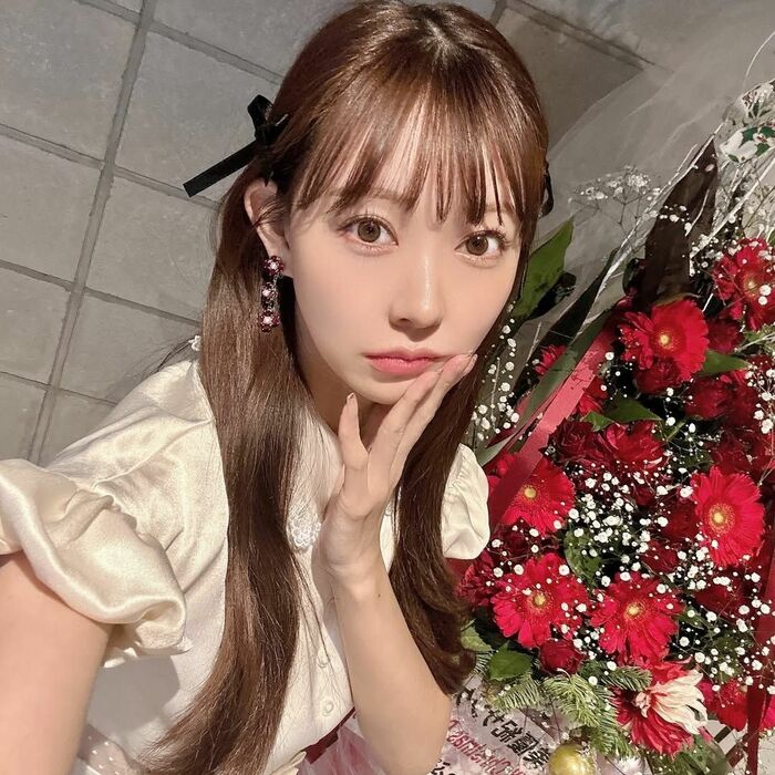 また、赤い花と一緒に映った自撮りショットでは、口元に手を当てており、髪には黒いリボン、耳には花柄のピアスを付けていることがわかります。