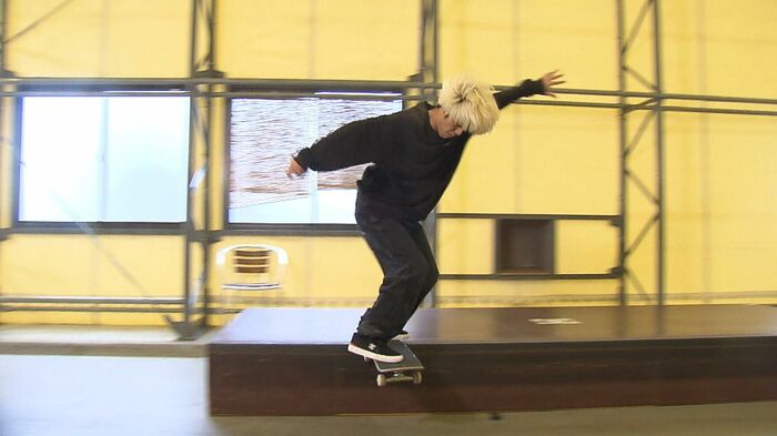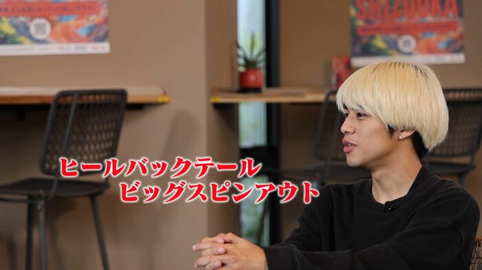 「ヒールバックテールビッグスピンアウト」は得意のヒールフリップで障害物にボードをかけ、飛び降りるときにも、ボードを横回転させる超大技。