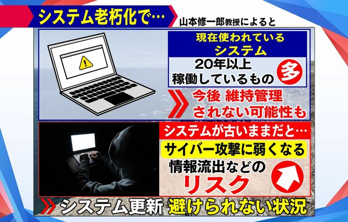 現在使われているシステムは20年以上稼働しているものも多く、サイバー攻撃への脆弱性から、情報流出などのリスク軽減のために、システム更新は避けられないという状況が迫っているというのです。