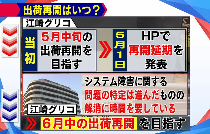 江崎グリコは当初、出荷再開は5月中旬を目指すと話していましたが、5月1日にホームページで再開延期を発表しました。現在「システム障害に関する問題の特定は進んだものの、解消に時間を要している」とし、6月中の出荷再開を目指しています。