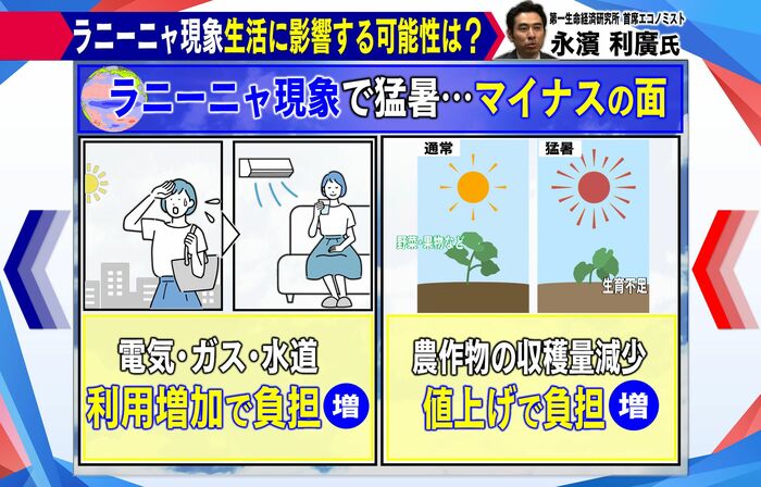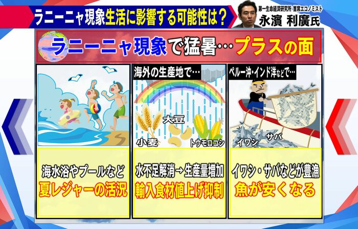 第一生命経済研究所首席エコノミストの永濱利廣氏によると、ラニーニャ現象によってプラスの面は、