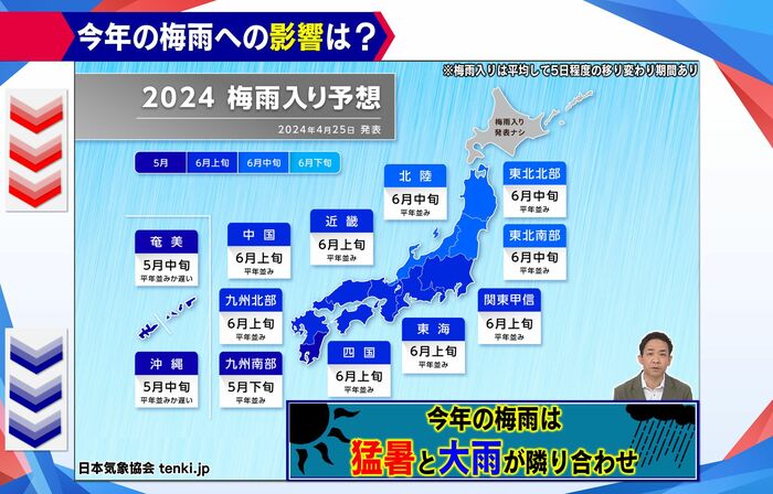 まず今年の梅雨入り予想ですが、沖縄は5月の中旬ということで平年より少し遅くなっています。その他の場所は平年並みとなっています。