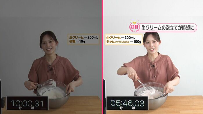 シェアトピ学生リポーターの濵地佑里恵さんがホイップクリーム作りに挑戦!砂糖を入れた場合はツノが立つまで、およそ10分かかりましたが、ジャムを入れた場合は半分近い時間で泡立てることができました。ケーキ作りの際に手軽にホイップクリームが作れるので、ぜひ活用してみてください。