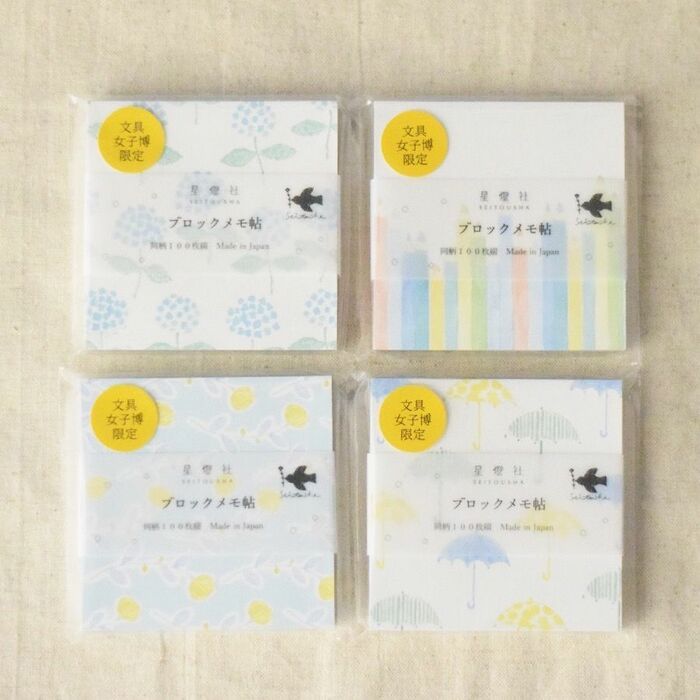 文具女子博限定ブロックメモ帖は、手のひらサイズのかわいらしい大きさで、全4柄。「傘模様」や「あじさい柄」など、これからの季節を感じられるデザインです。