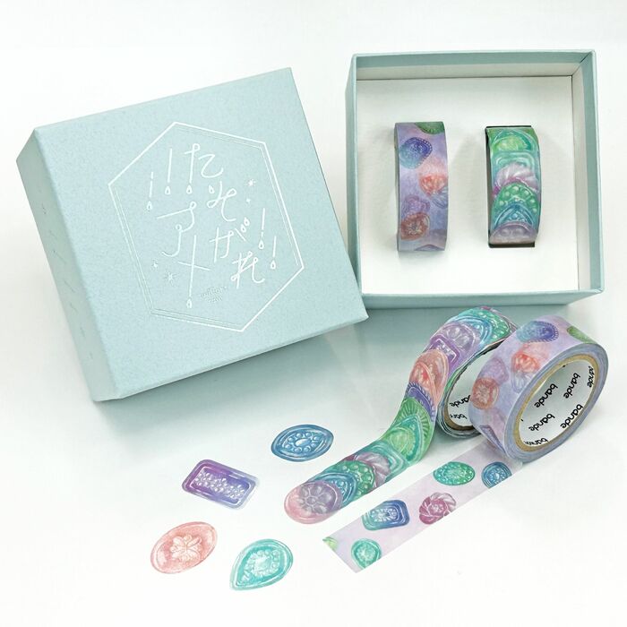 季節にぴったりで清涼感ある文具を販売。夕日が沈んでいく、黄昏どきに降る雨をイメージしたグラデーションカラーで作られたドロップスのステッカーとマスキングテープセットを文具女子博とbande storeのみの限定スペシャルBOXでお届け!