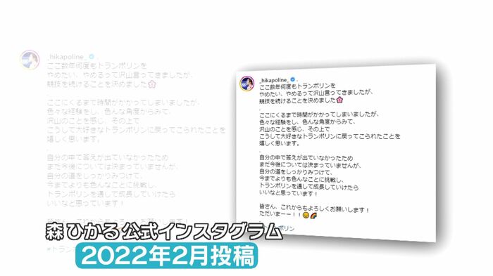 競技の引退も考えていた森選手ですが、東京オリンピック翌年の2022年2月、自身のインスタグラムで「競技を続けることを決めました」と投稿しました。