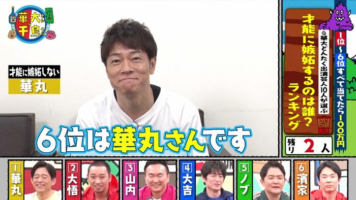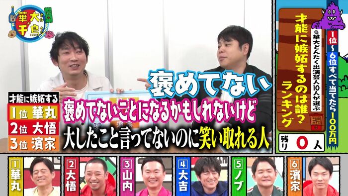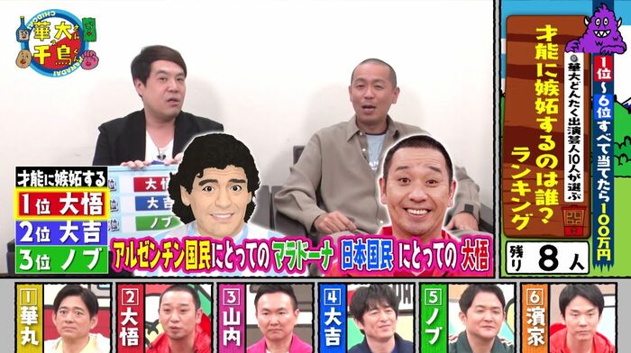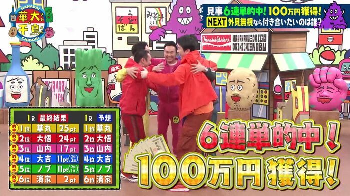 華丸さんが「(賞金の山分けは)6人で?」と聞くと、進行を務めていたダイアンがすかさず「いやいや8人で」と即答。