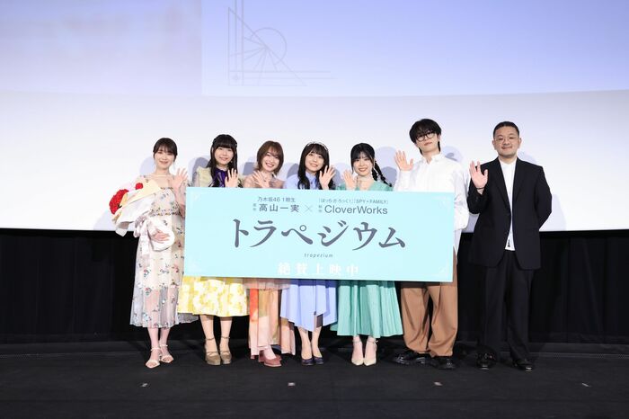 高山一実さんが原作を手掛けた、アニメーション映画『トラペジウム』の公開記念舞台挨拶が5月11日に行われ、高山さん、声優を務めた結川あさきさん、羊宮妃那さん、上田麗奈さん、相川遥花さん、木全翔也さん(JO1)、篠原正寛監督が登壇しました。
