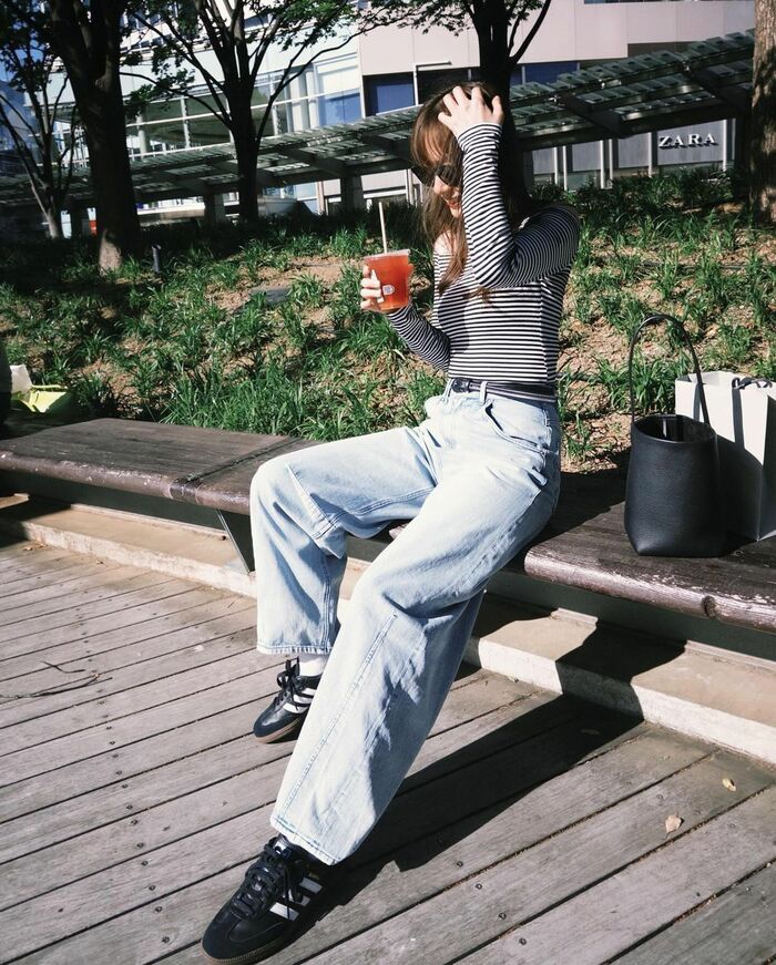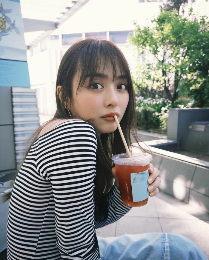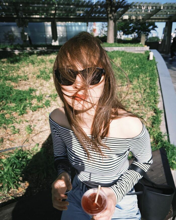 オフショルダーのボーダー柄のトップスにデニムを合わせたカジュアルコーデでドリンクを片手にこちらを見つめる彼女感ショットも。