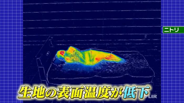 5分間、横になり寝返りをうつと、体に触れていた部分は温度が高いことを示す赤色になったのですが、その5分後には、ほぼ青色になり生地の表面温度が下がっていることがわかります。