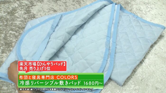 ちなみに、先月の「楽天」売り上げ1位のひんやりパッドもリバーシブルタイプの商品「布団と寝具専門店 COLORS」の「冷感リバーシブル敷きパッド」(1680円〜)。
