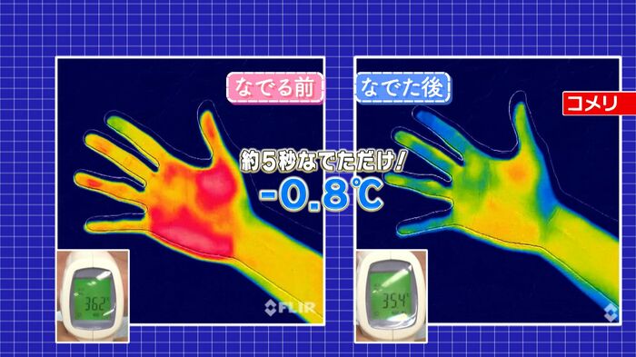 表の冷感面を5秒ほど軽くなでただけでも手のひらの表面温度は、36.2℃から35.4℃と、