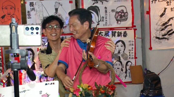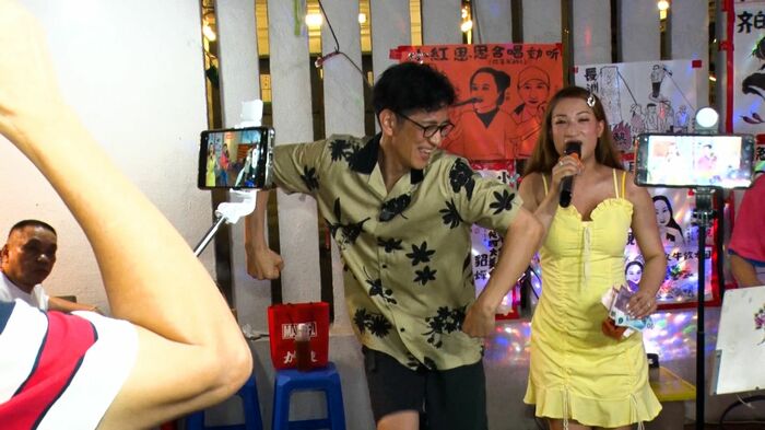 そして、エンタメエリアにも潜入。お酒を飲んだり、路上カラオケを楽しんだりと、おじさんたちの癒しスポットのよう。アンタッチャブルが、生配信中の歌手と出会い、参加する展開に!