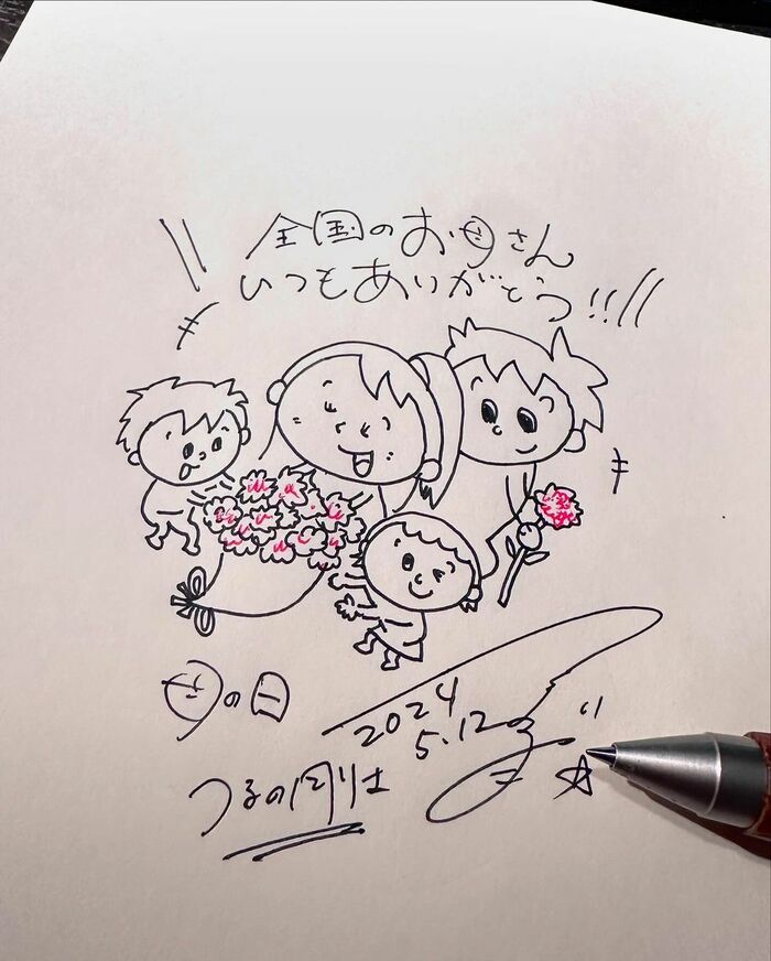 さらに、つるのさんは全国のお母さんへ向けた母の日のイラストも投稿。子供からお母さんに花束を贈る家族団らんを描いたかわいらしいタッチのイラストにファンからは「イラストめちゃくちゃ可愛い!」「素敵なイラストにほっこりしました」と称賛の声が寄せられました。