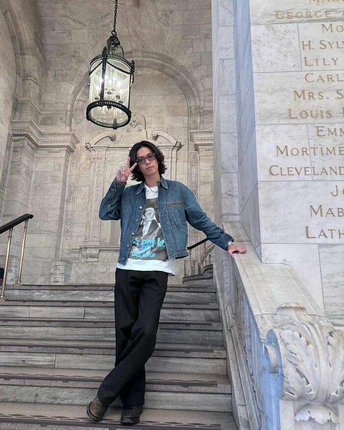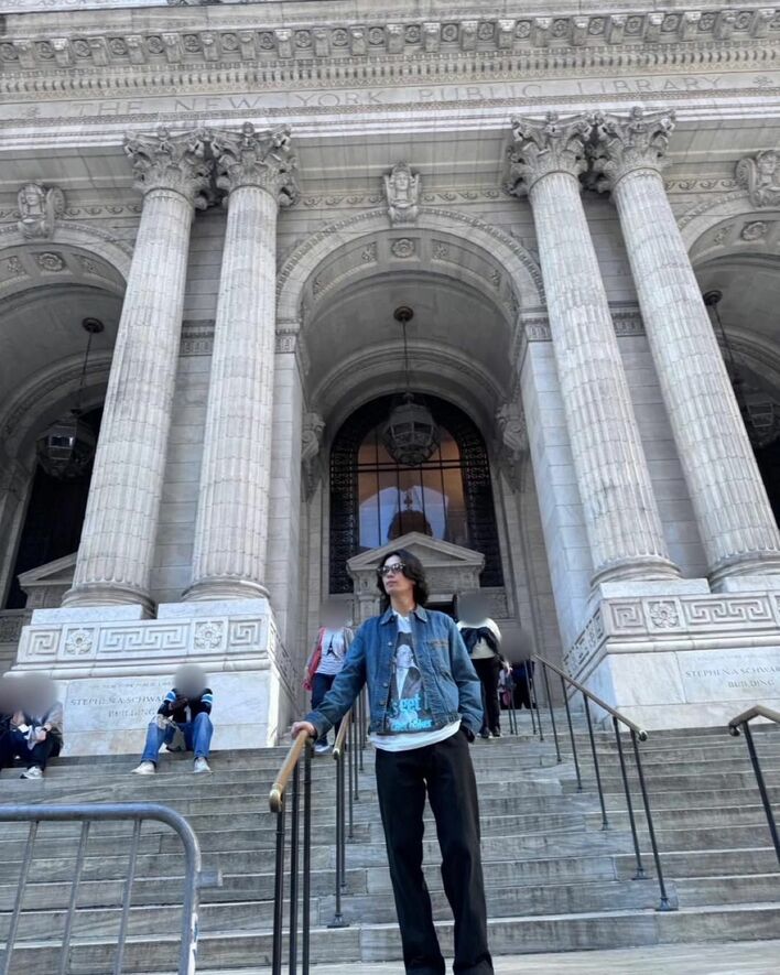 公開された写真には、デニムジャケットに黒のパンツを合わせたカジュアルなコーディネートで、ニューヨーク公共図書館の階段でポーズを決めている姿が!