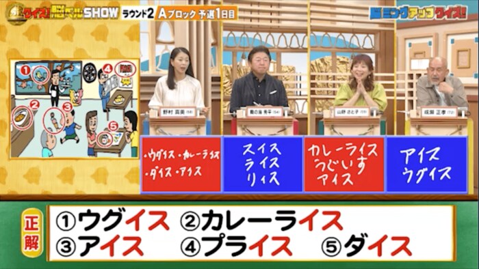 舞の海秀平さんは「スイス/ライス/リィス」と3つ解答していますが、不正解。野村真美さんと山野さと子さんが正解でした。