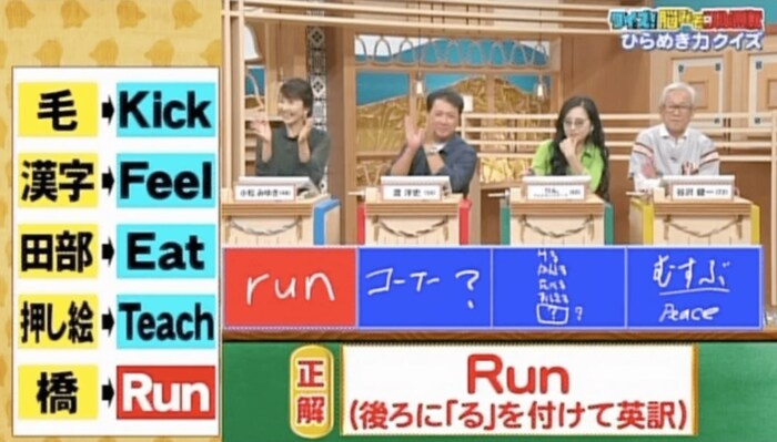 正解は「Run(橋+る=走る)」。つまり、左側の漢字の後ろに「る」を付けて英訳すると、右側の英語の意味になります。