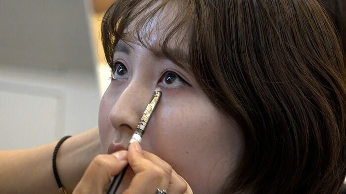 ホワイトベースのファンデーションで赤みを消していき、全体を明るく仕上げていくソンヨン院長。