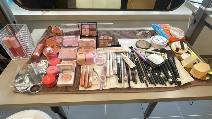 テーブルにはソンヨン院長が持参したメイク道具がズラリ!色鮮やかなリップやアイシャドウ、チークを塗る際に使うブラシなど厳選されたものが用意されています。
