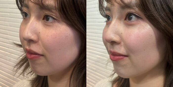 比較してみると、顔のパーツが強調されたことで、目や口が中心に寄り、顔が小さくなったようにも見えます。鼻先のチークやハイライト、涙袋が効果を発揮していますね。