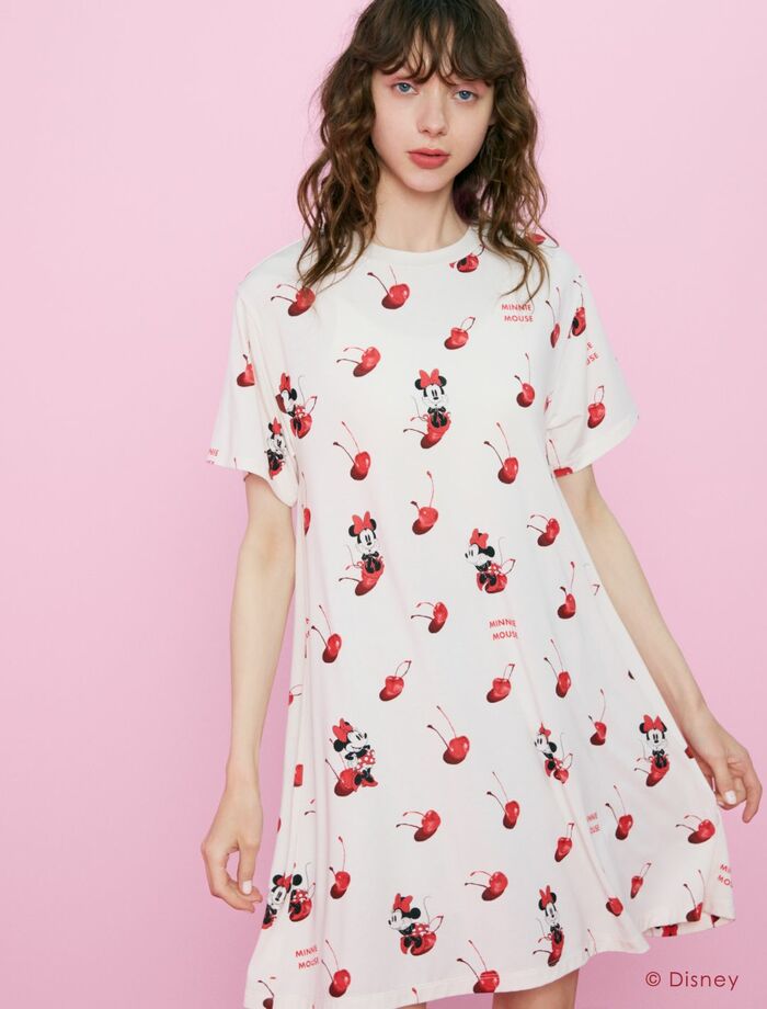 まず、ジェラートピケのルームウェア。フルーツの上にちょこんと座るミニーの総柄プリントがかわいいワンピースが登場します。
