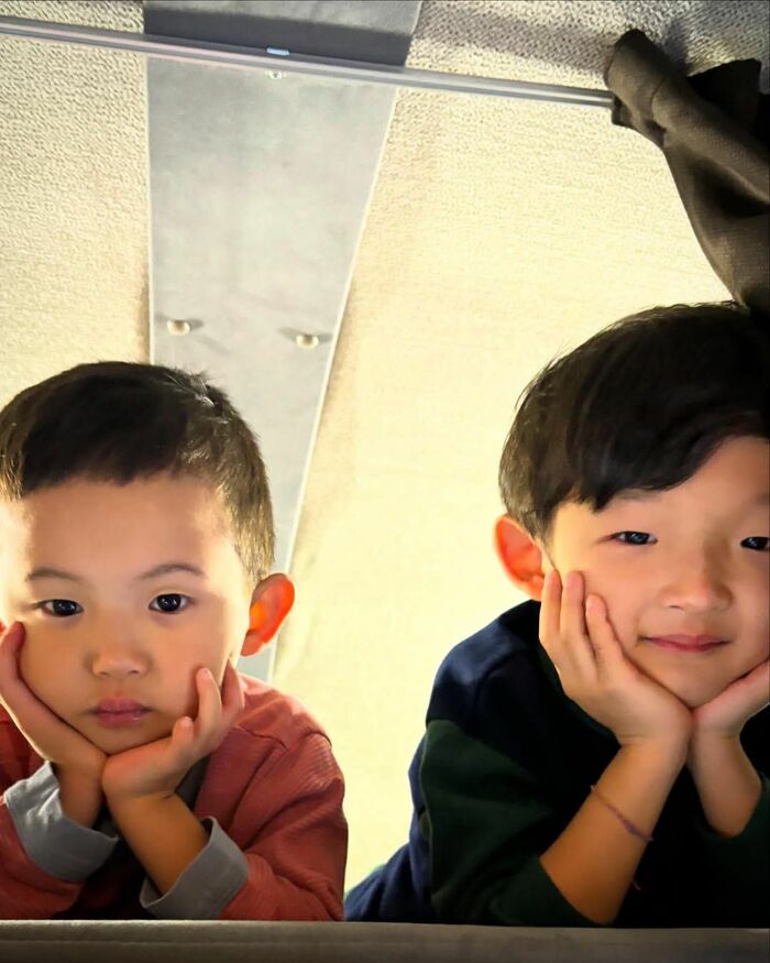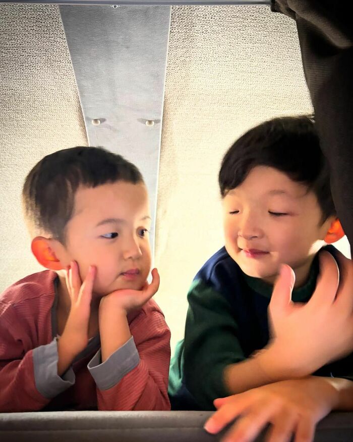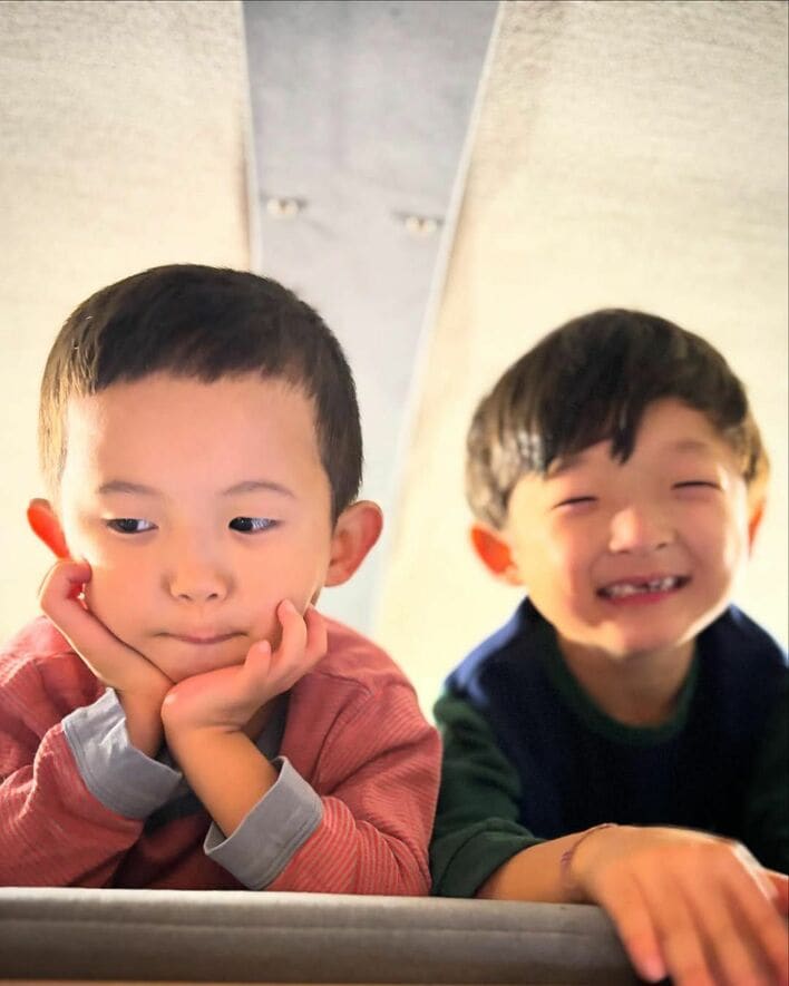 公開された写真には、長男・陽喜くん(6)、次男・夏幹くん(4)が、仲良く横に並び、両手を顔に添えカメラを見つめる様子が。2人とも、目鼻立ちや表情の雰囲気が中村さんにそっくりですね。