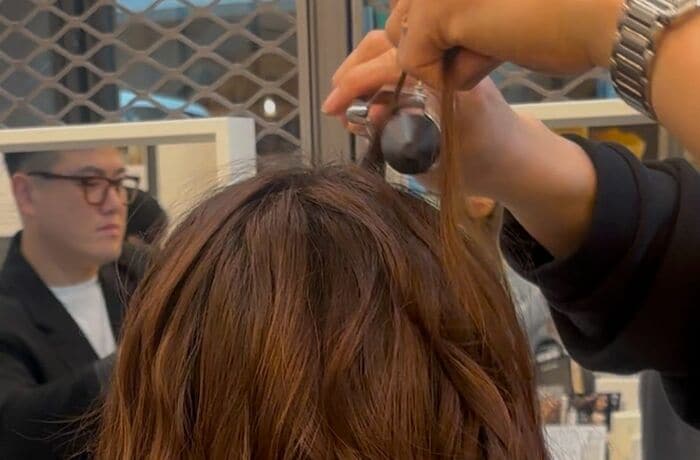 頭の根元の方からしっかりカールを入れることでボリューム感を演出していきます。