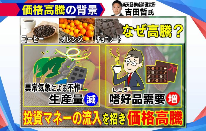 また、高騰しているのはコーヒーだけではありません。コーヒー、そしてカカオ、さらに、オレンジまでもが高騰。