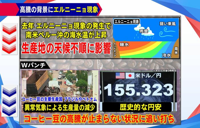 コーヒーの大原産国ブラジルやベトナムでも、異常気象による生産量の減少が起き、そこに歴史的な円安が追い打ちをかけ、コーヒー豆の高騰が止まらなくなっているのです。