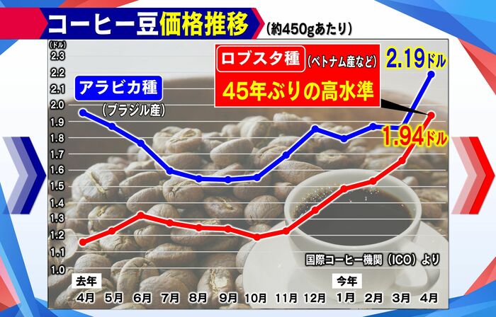 4月のコーヒー豆の国際価格は、インスタントコーヒー向けに使われる「ロブスタ種」のコーヒー豆(生産地ベトナムなど)が1ポンド(約450g)当たり1.94ドルと、前月比16.8%上昇。45年ぶりの高水準となっています。