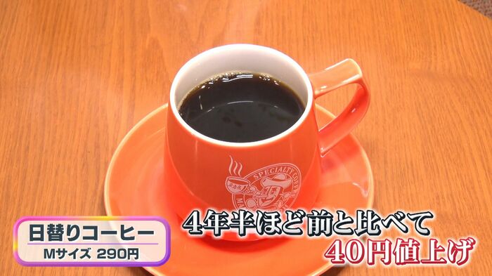 コーヒー豆の高騰に伴い人気の「日替わりコーヒー」は4年半ほど前と比べて40円値上げしたといいます。