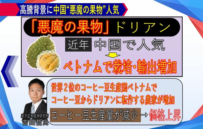 実は今、コーヒー豆生産量が世界2位のベトナムで、ドリアンの栽培と中国輸出のブームが起きています。