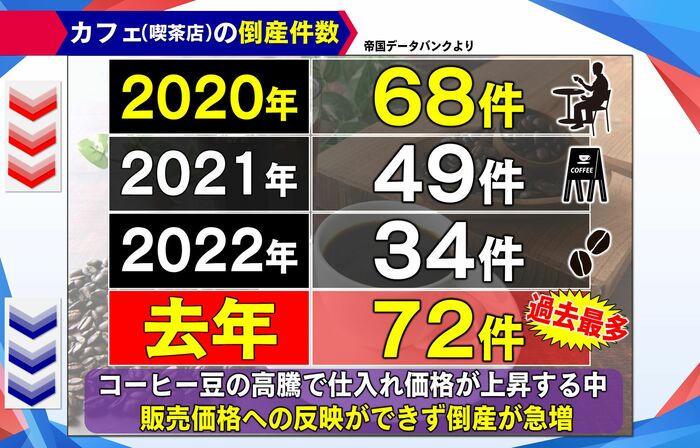 コーヒー豆の高騰で仕入れ価格が上昇する中、販売価格への反映ができず、カフェの倒産が急増してしまっている状況です。