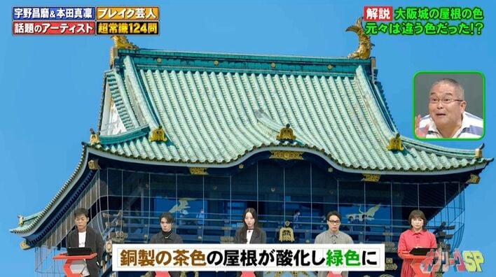 昭和6(1931)年に復元された直後の大阪城の屋根は、銅で出来ていたので茶色でした。それが今のような美しい色に変わったのは、銅が錆(さ)びたから。銅は長い時間をかけて酸化して錆びると、緑色に変色するのです。