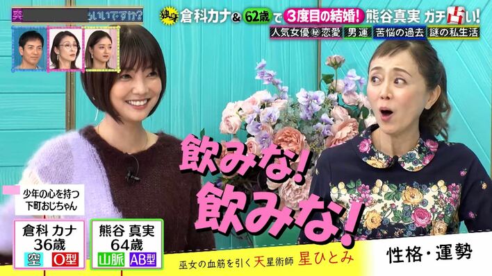 12月15日放送の『突然ですが占ってもいいですか?』は、倉科カナさん、熊谷真実さんが星ひとみさんに占われました。