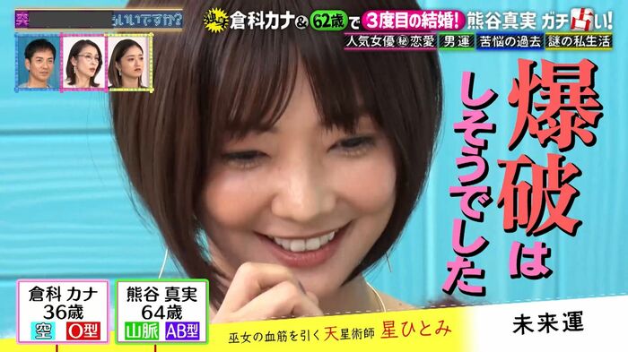 星さんが「倉科カナをやめた方がいい。『倉科さん』って呼ばれると波動が悪くなるから『かーこ』か『かな吉』」と新しい呼称を提案すると、倉科さんは「ちょっとあの…投票しますね。インスタとかで」と苦笑いしました。