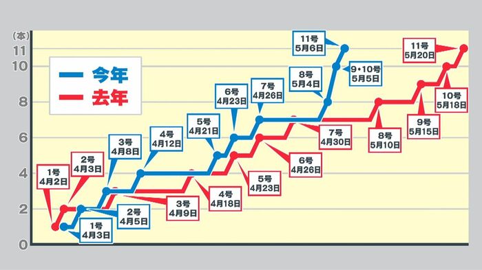 昨シーズン、大谷選手が11号ホームランを打ったのは、5月21日。今年は2週間以上も、早いペースなんです。