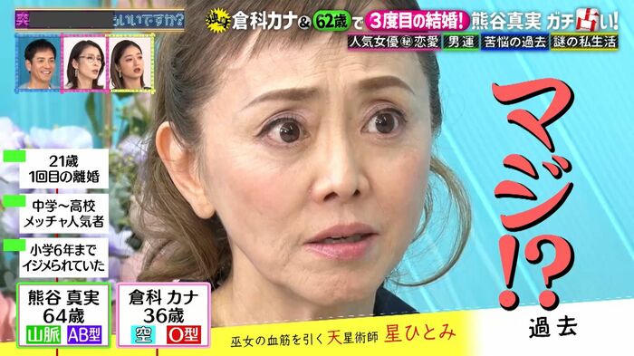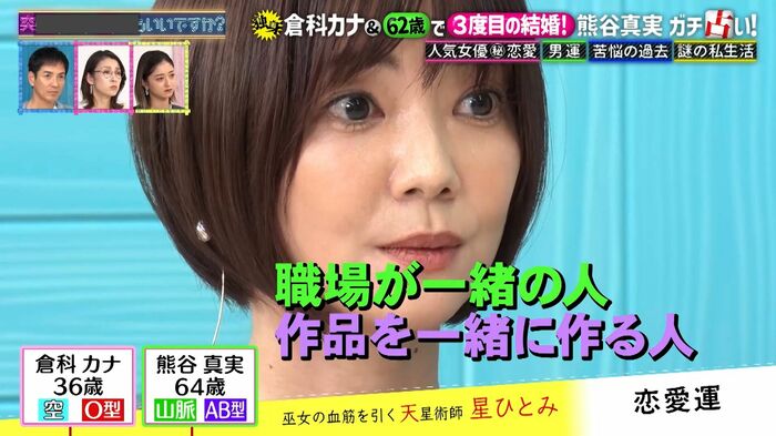 星さんは「2025年以降、メッチャ良い人と出会って40歳までに結婚する確率が85%」と言うものの、「“倉科カナ”でいる以上(相性の良い男性は)集まらない」とズバリ。これに倉科さんは「私、かな吉にします!」と真剣な眼差しで答え、笑いを誘いました。