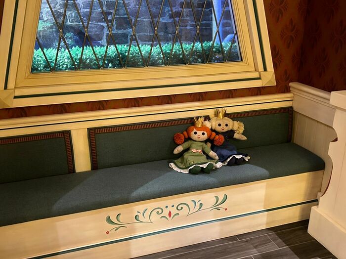 アナとエルサの人形は、アトラクションの待機列に置いてあるものと同じもの。