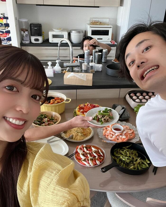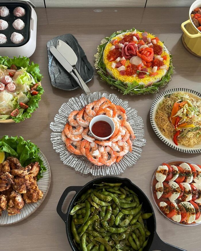 さらに、「前日から仕込んでご飯作って みんなで初節句のお祝いをしました」と、手料理を振る舞ったことを報告。マグロやサーモンを花の形に飾ったちらし寿司やシュリンプカクテルやカプレーゼなど、手の込んだ豪華な料理を披露しました。