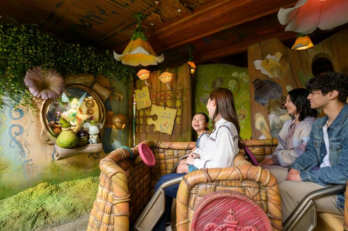 アトラクションの入口をくぐると、花やキノコ、絵の具やチーズなどすべてのものが大きくなり、自分たちが小さくなって妖精たちが住む世界に入り込んだ雰囲気を味わえます。
