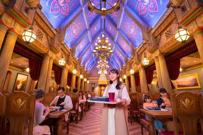 店内には、映画に登場するキャラクターたちに関する本やキャラクターたちをモデルにした美術品、「生まれてはじめて」が歌われたシーンに登場する数々の絵画が飾られていて、『アナ雪』の世界に飛び込んだような気分で食事が楽しめます。