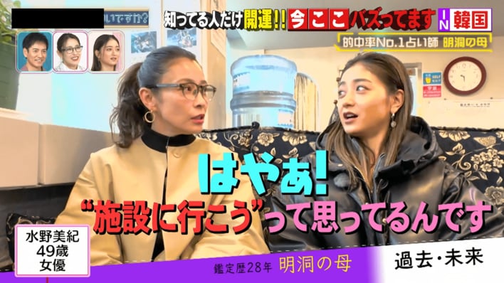 水野美紀さんと、“みちょぱ”こと池田美優さんが、5月7日(火)放送の『突然ですが占ってもいいですか?』(フジテレビ)で、韓国で的中率No.1と言われている占い師・明洞の母に占われました。