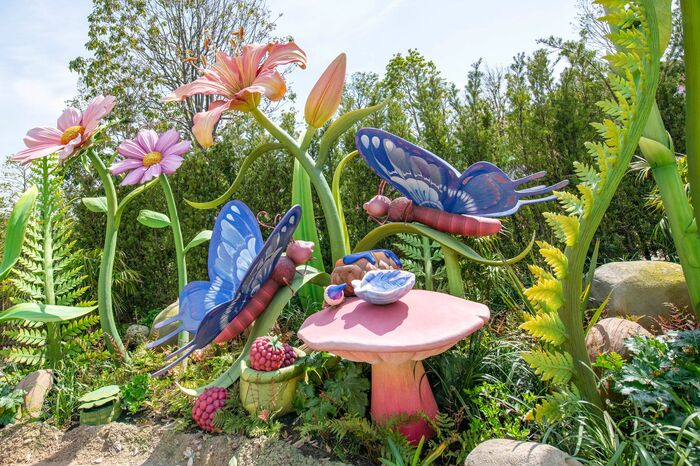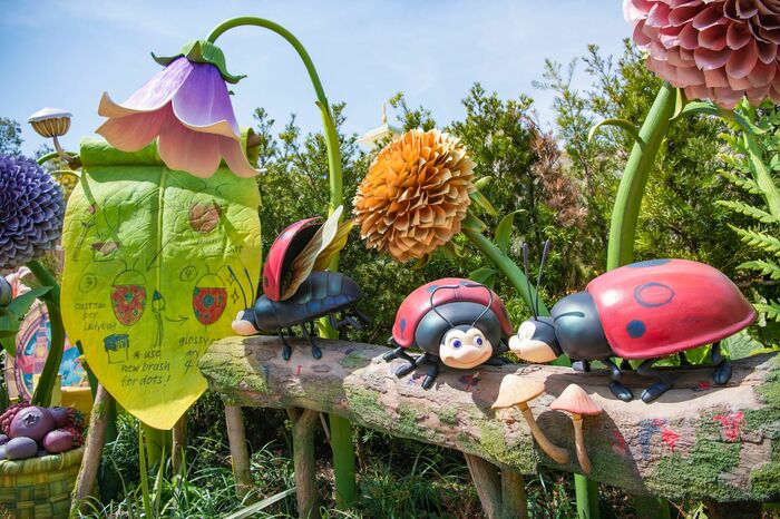 羽ばたく2匹の巨大な蝶が妖精によってカラフルに色づけされている様子や、色づけの順番待ちをしているてんとう虫にも出会えます。