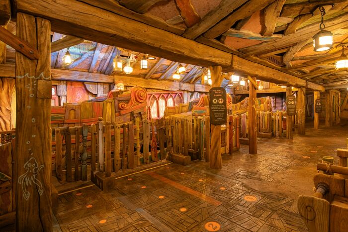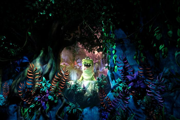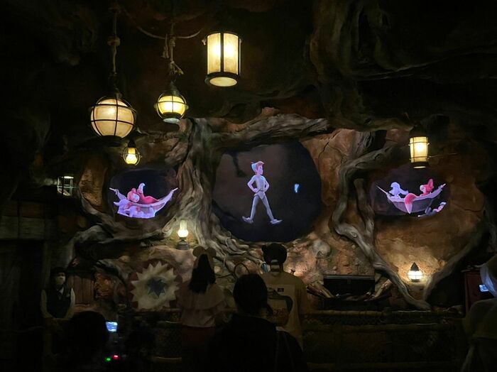 ロストキッズが海賊船を模して造ったボートに乗り込むと、映画でもおなじみの「リーダーにつづけ」の曲とともに、ボートはジャングルの中を進みます。