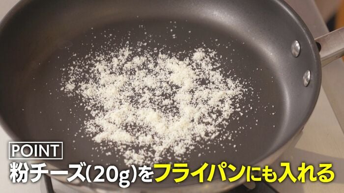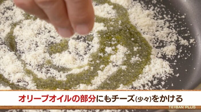 ①フライパンに粉チーズ(20g)を入れオリーブオイル(大2)を垂らす