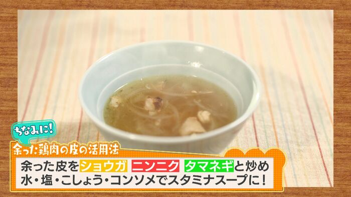 ちなみに!下準備の時に切り落とした余分な皮は軽く炒めて、生姜・ニンニク・水・コンソメなどを合わせ、「簡単スタミナスープ」を作ることもできちゃうので、こちらもオススメ!